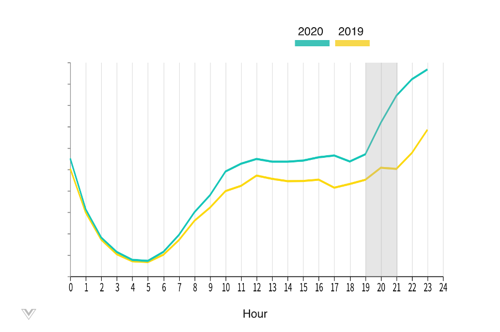 전형적으로 온라인 패션 쇼핑은 퇴근 후 또는 외부 활동에서 돌아오는 오후 9시 경에 시작됩니다. 지금의 상황에서는 사람들의 쇼핑 시작이 더 앞 당겨져 오후 7시에 시작한다는 것을 알 수 있습니다. 이는 외식을 하거나 야외 활동을 하는 사람의 수는 줄어들고, 대신에 이른 귀가를 선택한 사람이 많기 때문입니다. 사회적 거리두기가 널리 퍼지면서, 이런 추세는 적어도 향후 일정 기간 동안은 계속 될 것입니다.