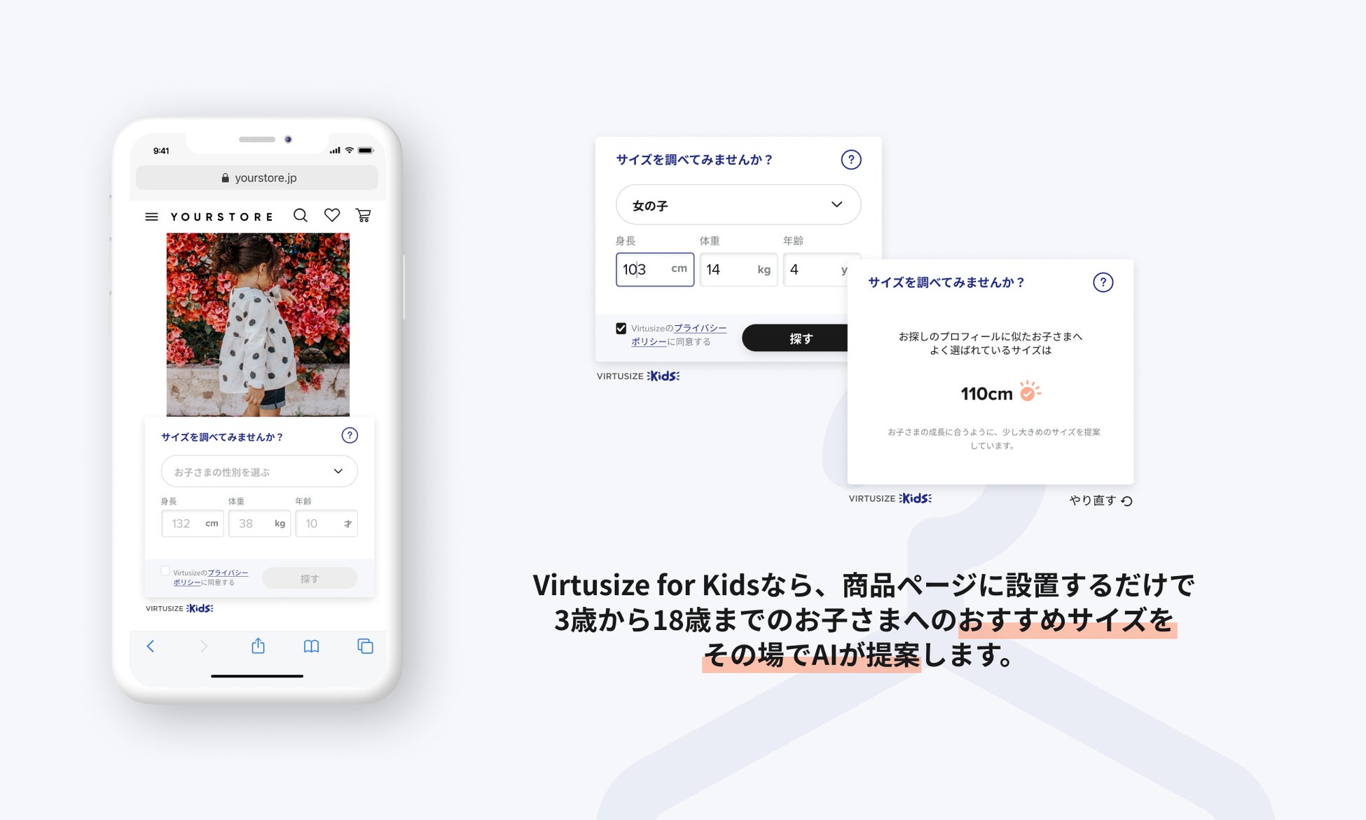 子供服は同じサイズ表記でも製造社やブランド、また国によってもサイズ感が異なり、さらに試着が難しいため、かねてより子供服対応のサイズレコメンド機能のリクエストを多くいただいておりました。この度、お客様のお声にお応えし、Virtusizeでは子供服専用サイズレコメンドサービス「Virtusize for Kids」の開発を完了いたしました。これにより、オンラインでご自身の服だけではなく、子供服を購入される親御様やギフトの購入をご検討されている方でも、Virtusizeを活用して、より適切なサイズを選ぶことができます。