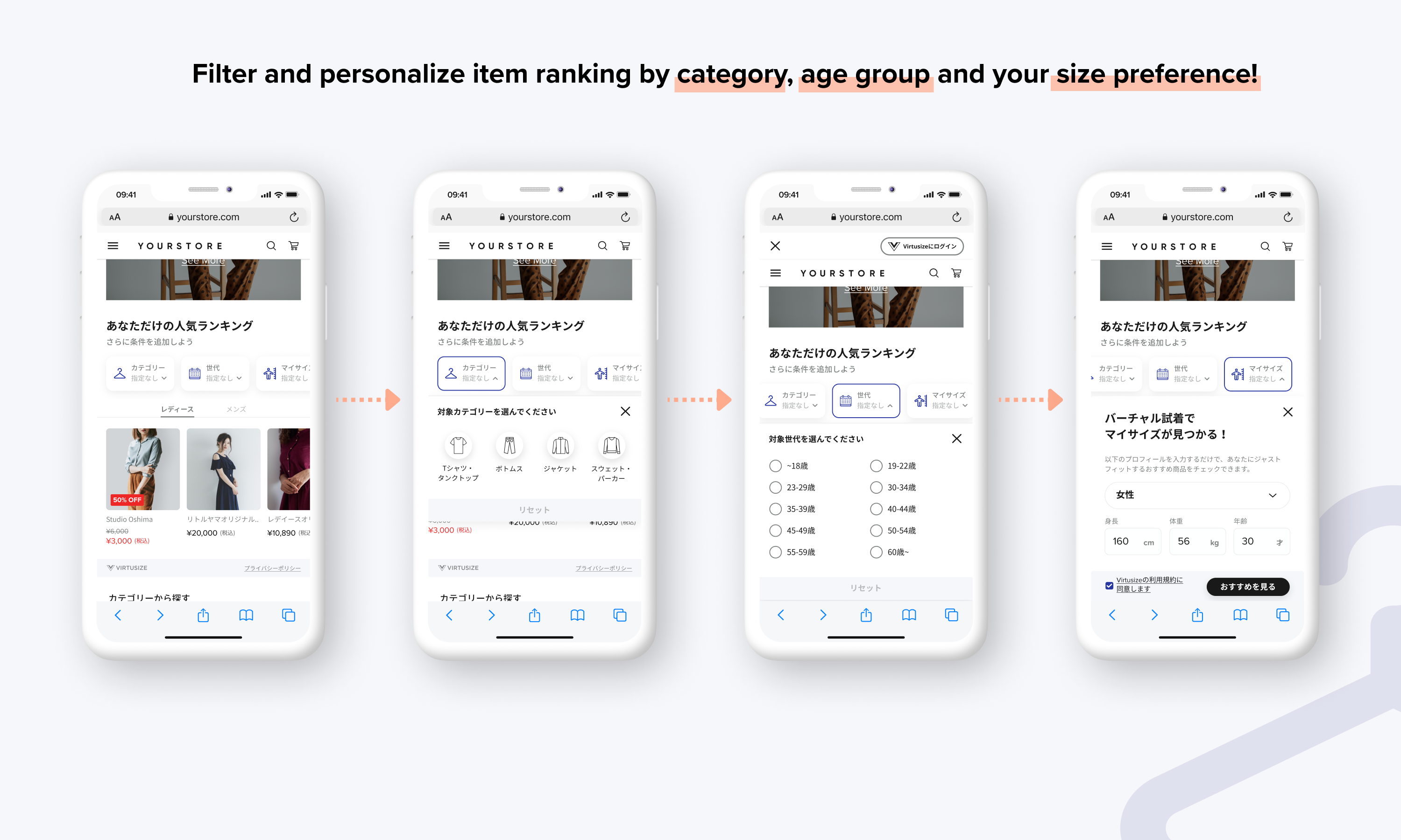 이번 FittingRoom Discovery는 Virtusize의 신체 데이터와 인터랙티브한 UI를 활용하여 처음 스토어를 방문한 고객도 실제 매장에서 직원과 상담하며 상품을 추천받는 것 같은 양방향 소통을 EC 사이트의 입구인 홈페이지에서 실현하여 고객이 좋아하는 상품과 만날 가능성을 높입니다.