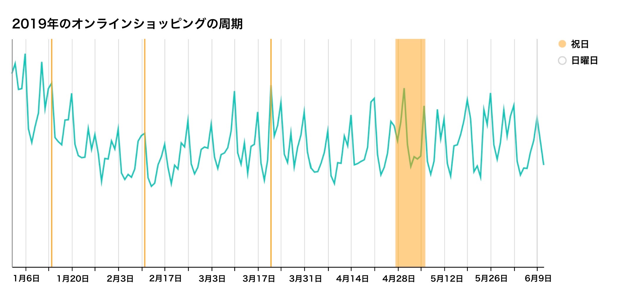 2019年における収益の時系列データを見てみると、祝祭日と重なる場合を除き、ほぼ毎週日曜日に収益がピークに達しています。