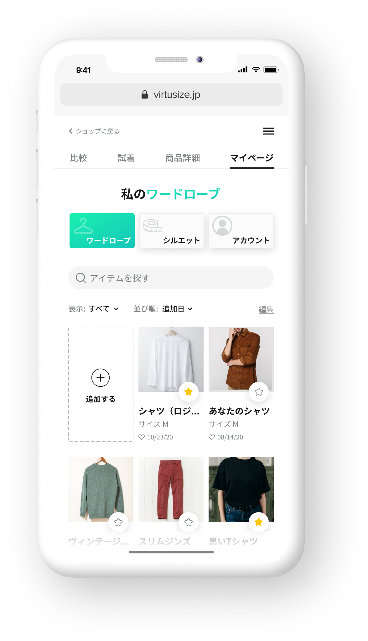 ることができます。バーチャサイズが導入されているショップで購入したすべての商品や自分で追加したアイテムは、ブランドやカテゴリ、サイズに関わらず、自分だけのオンラインワードローブで管理。お気に入り登録や新しい商品を購入するときにはワードローブ内にあるアイテムと比較をすることができます。
