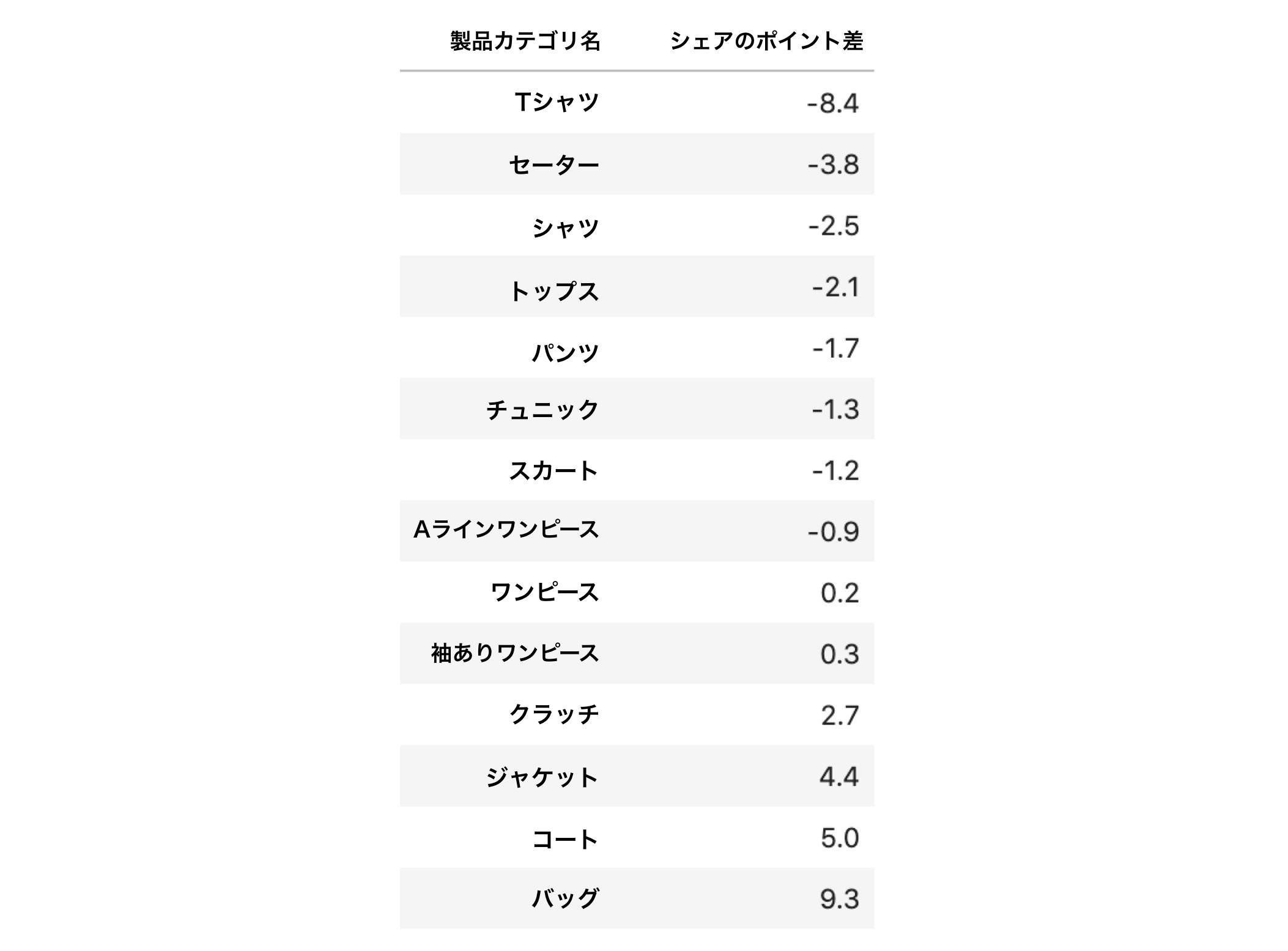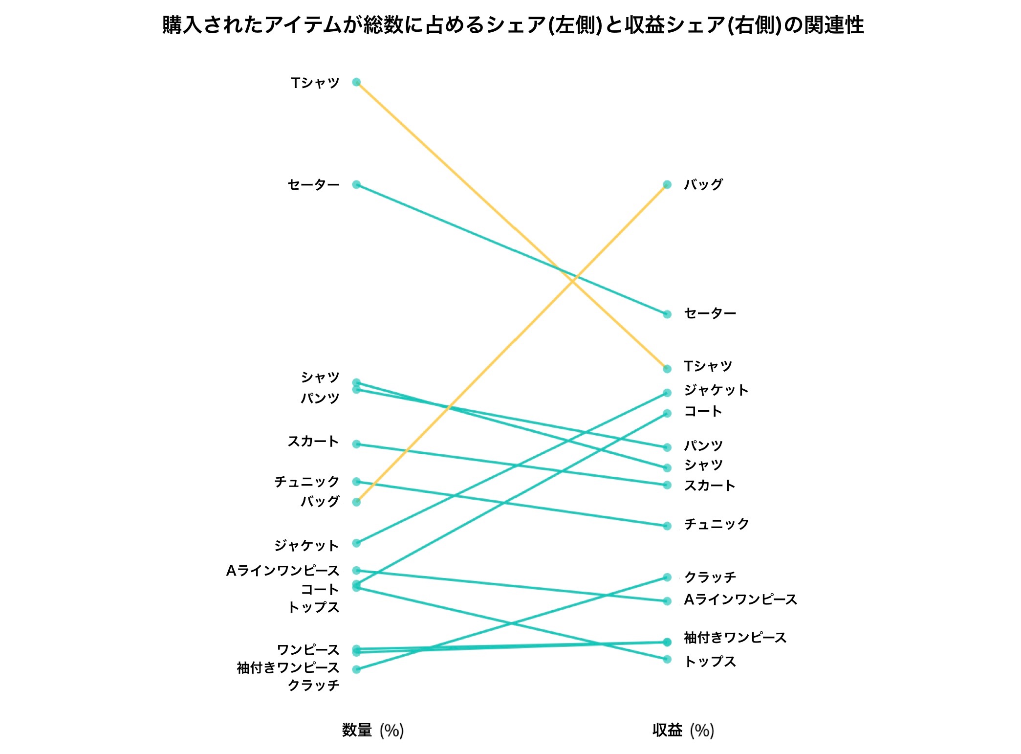 パーセントポイント差(収益シェアのパーセントポイントから数量シェアのパーセントポイントを引いたもの)を図(b)に示しています。バッグとTシャツは、図中の線の傾斜が急であることからも明らかなように、とくにその差が大きくなっています。