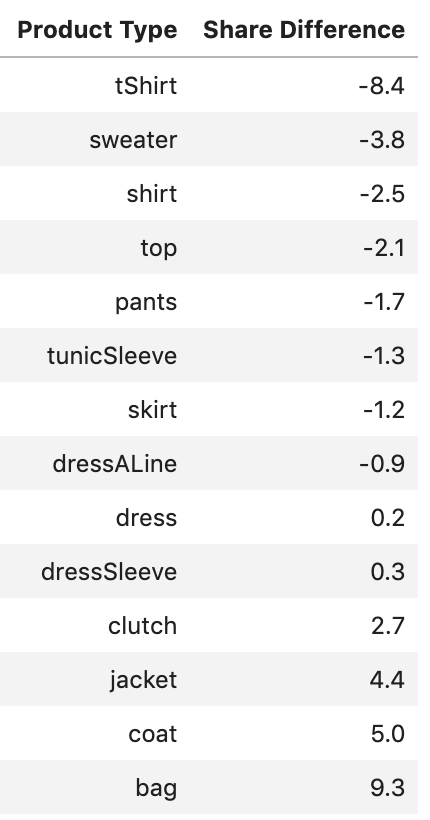 T-shirts might be bought most often, but they are third when it comes to revenue.Bags bring in the most money when compared to other items. They only make up 6.4% of the items bought, but contribute 15.7% to the total revenue. The percentage point difference – revenue share minus quantity share – is shown in (b). Bags and T-shirts have the highest differences as was evident from the steeply sloping lines in (a).
