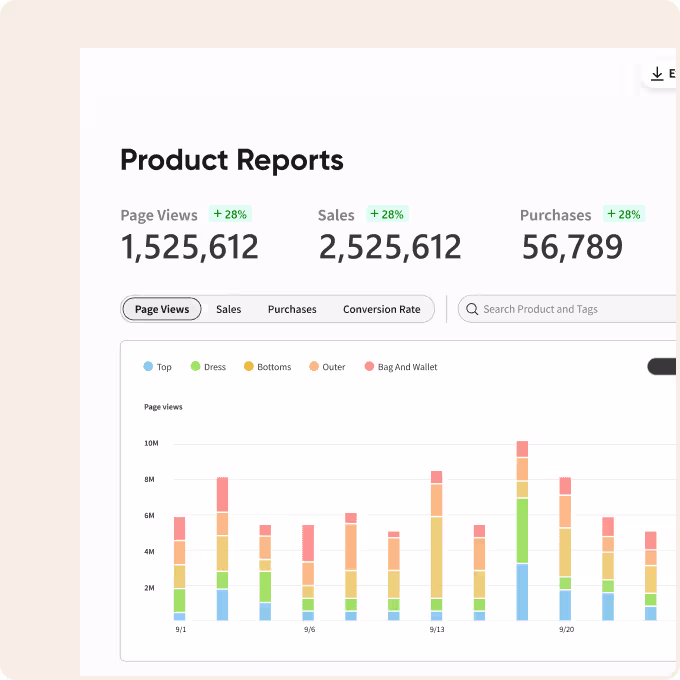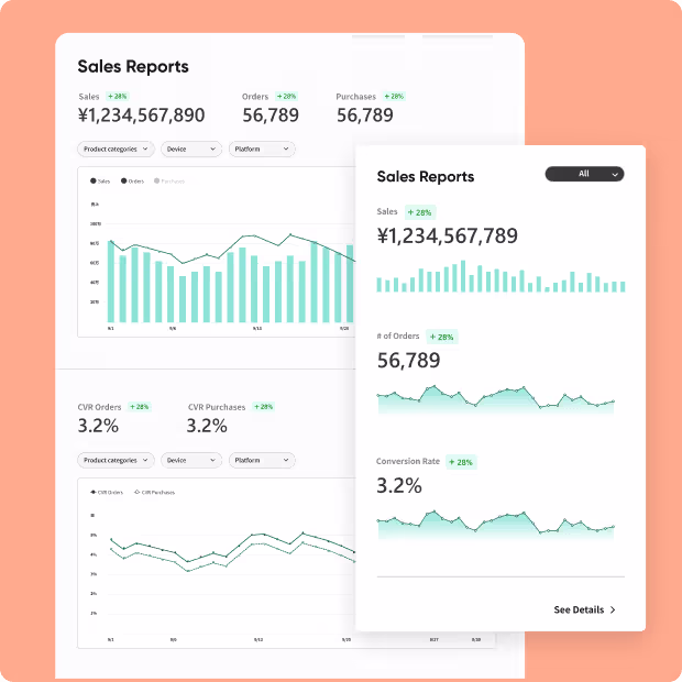 Go Sale Report where you can see how main KPIs such as Sales, Conversions rate went. You can download visualized sales chart as PDF. No need to create a colorful chart anymore.