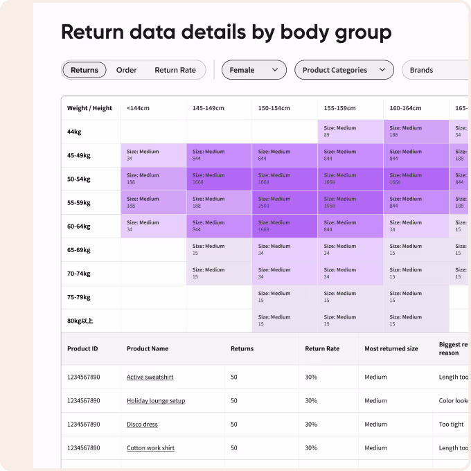 Return data can be also utilized for product manufacturings. By connecting our unique body data to returned data, you can see where the size mismatches happen the most by looking at body group x order heats-map.